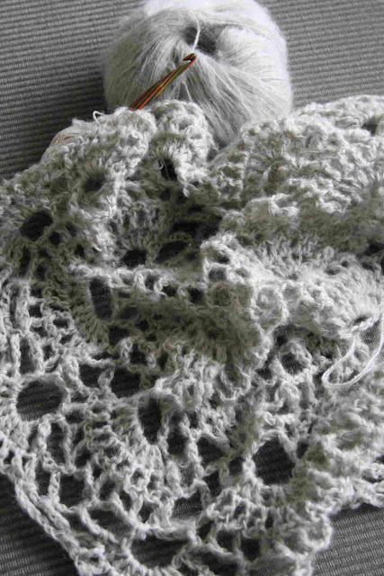 7. omg: hækl *2 fm sammen, 2 fm* = 12 - nu puttes der fyld i