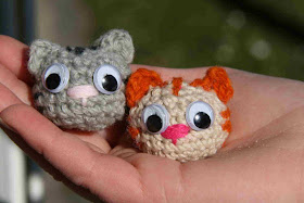Ørerne hækles på samme måde som katten - direkte på i en vilkårlig maske ved siden af afslutningsringen. Venstre øre startes oppefra med 3 lm, 1 stgm, ½stgm 1 fm - alle i samme maske. Højre øre hækles nedfra med 1 lm, ½ stgm, 2 stgm alle i samme maske - afslut og væv snoren ned langs den sidste stgm til hæftning. 10 mm rulleøjne og en lyserød knap som tryne - nemmere bliver det ikke.