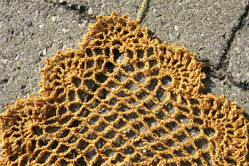 9. omg: vend med 1 lm, hækl 2 km til lm-buen, her hækles 3 lm (=1 stgm), 1 stgm, 2 lm, 2 stgm, 3 lm hen til første lm-bue, hækl 1 fm om lm-buen efterfulgt af *5 lm, 1 fm om næste lm-bue* gentag 5 gange, hækl dernæst 3 lm, 2 stgm, 2 lm, 2 stgm