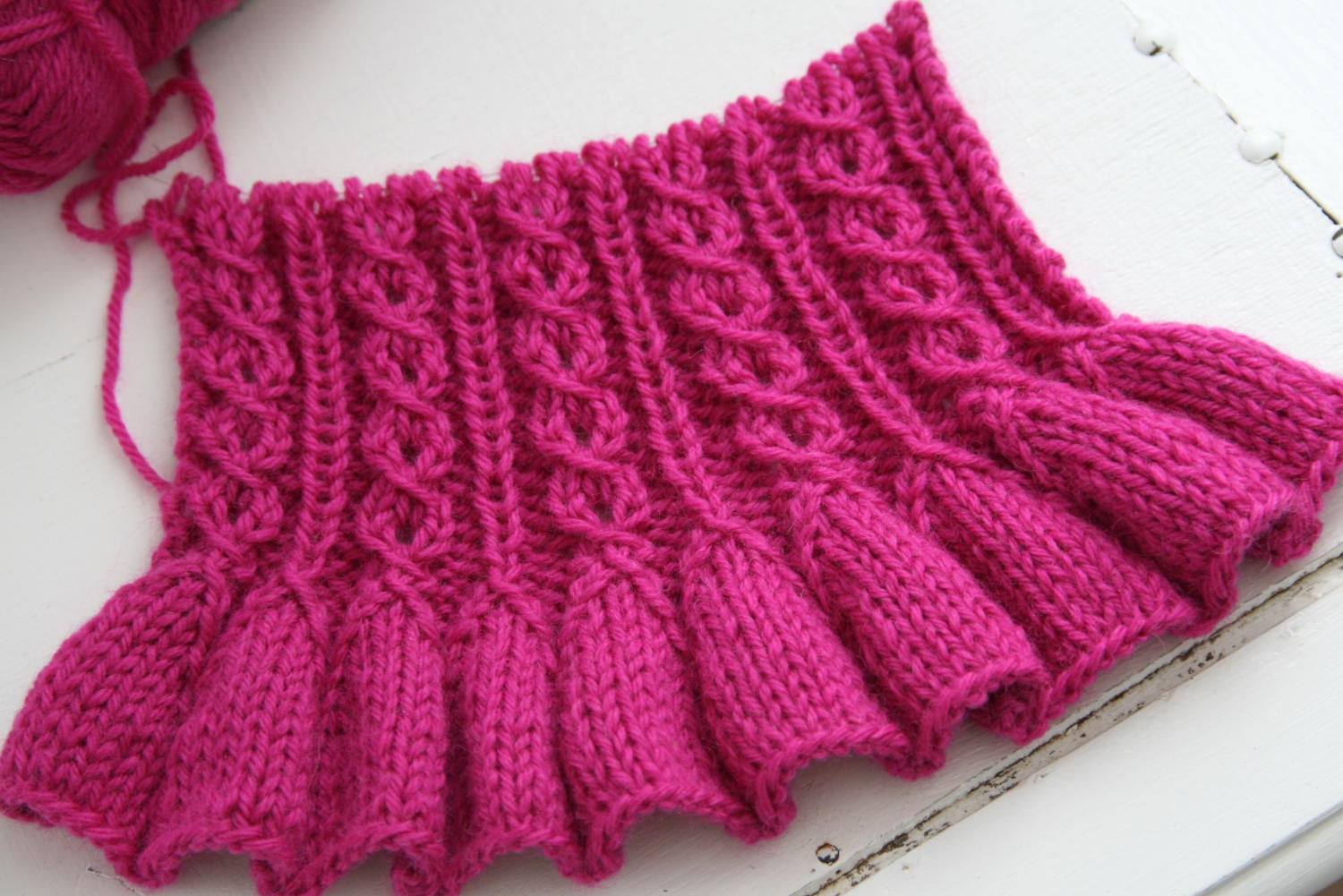 Vend med 1 lm, hækl 2 km til lm-buen, her hækles 3 lm (=1 stgm), 1 stgm, 2 lm, 2 stgm, 3 lm hen til første lm-bue, hækl 1 fm om lm-buen og dernæst 3 lm, 2 stgm, 2 lm, 2 stgm i næste V.