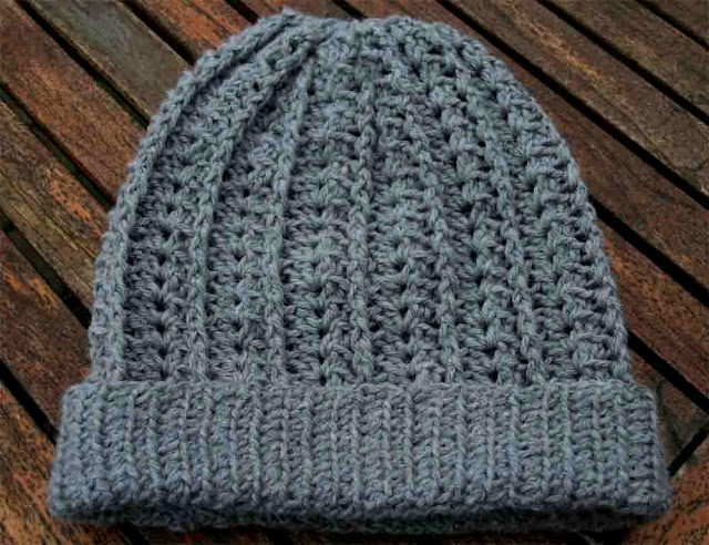 Og så har jeg endelig lavet en hue til mænd - eller til store drenge! Den er i rigtig "hobo"stil, men min mand NÆGTER at posere med huer trods den klær' ham - så derfor får I et fladt billede - jeg synes den er vildt fed når den kommer på + den er super hurtig at lave: